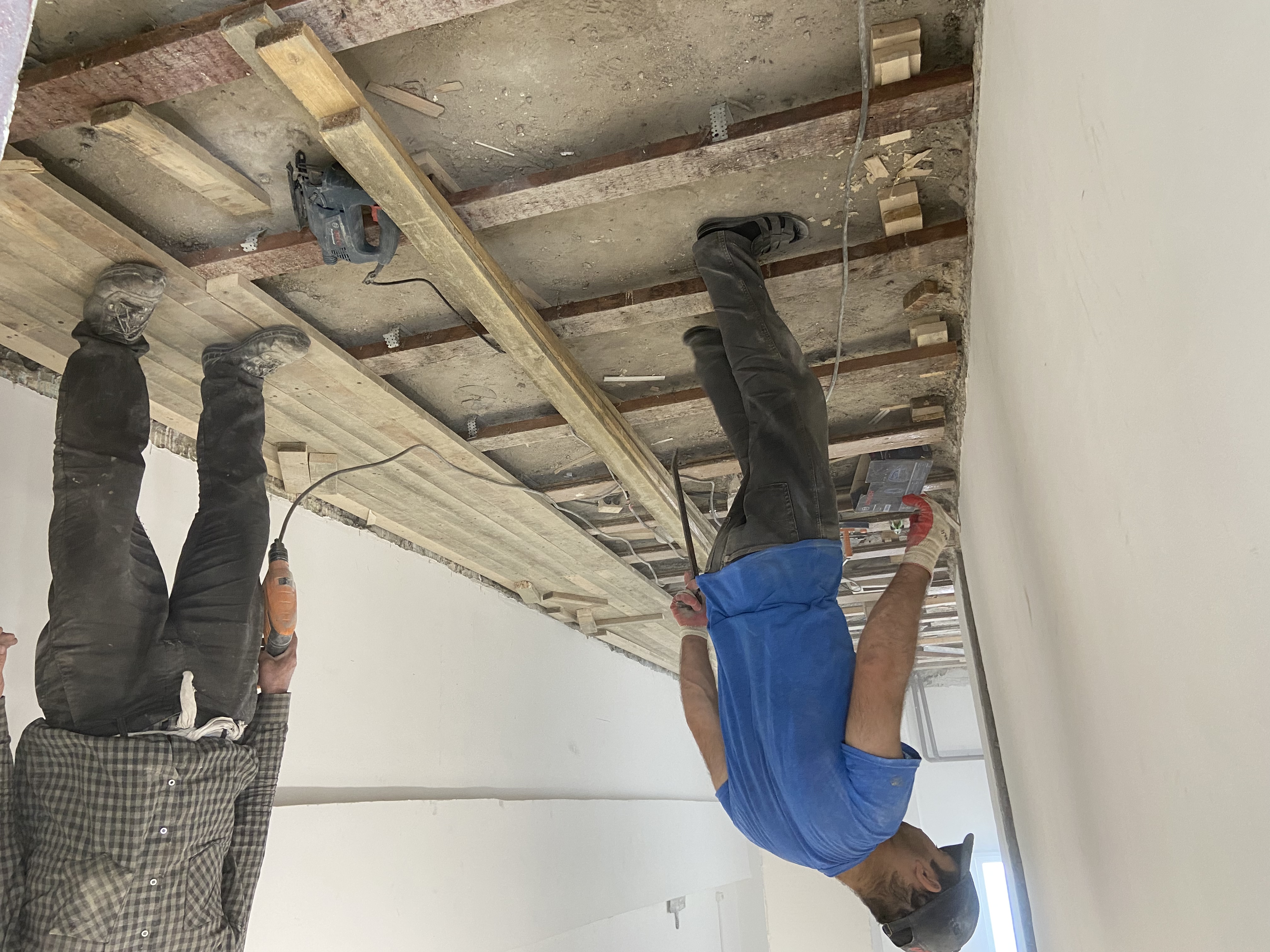 Вставили двери 80%. Подшили потолок из гипсокартона в одном помещении. Сделали канализацию. Уложили плитку на 65%. Начали ремонт отопления.