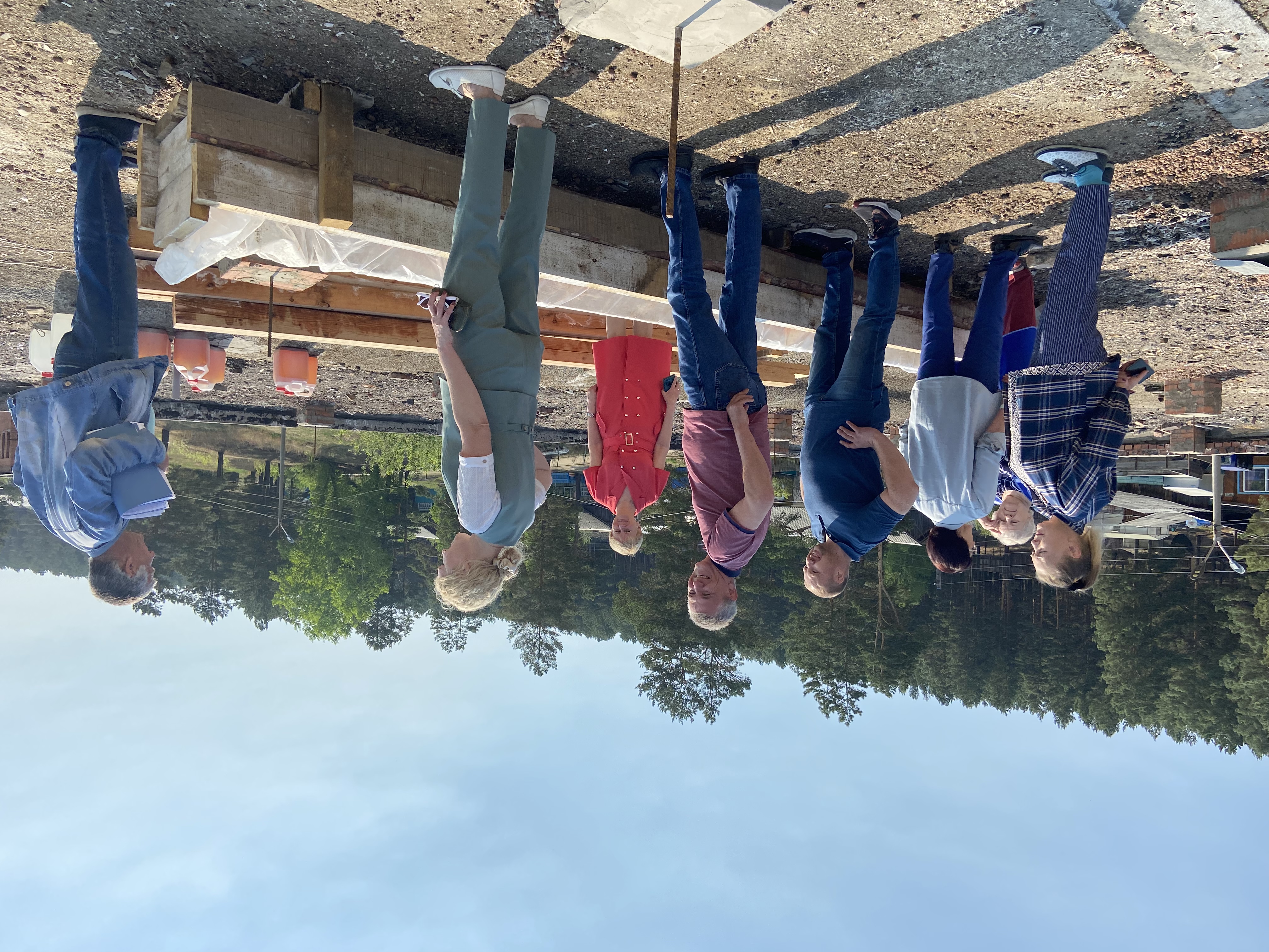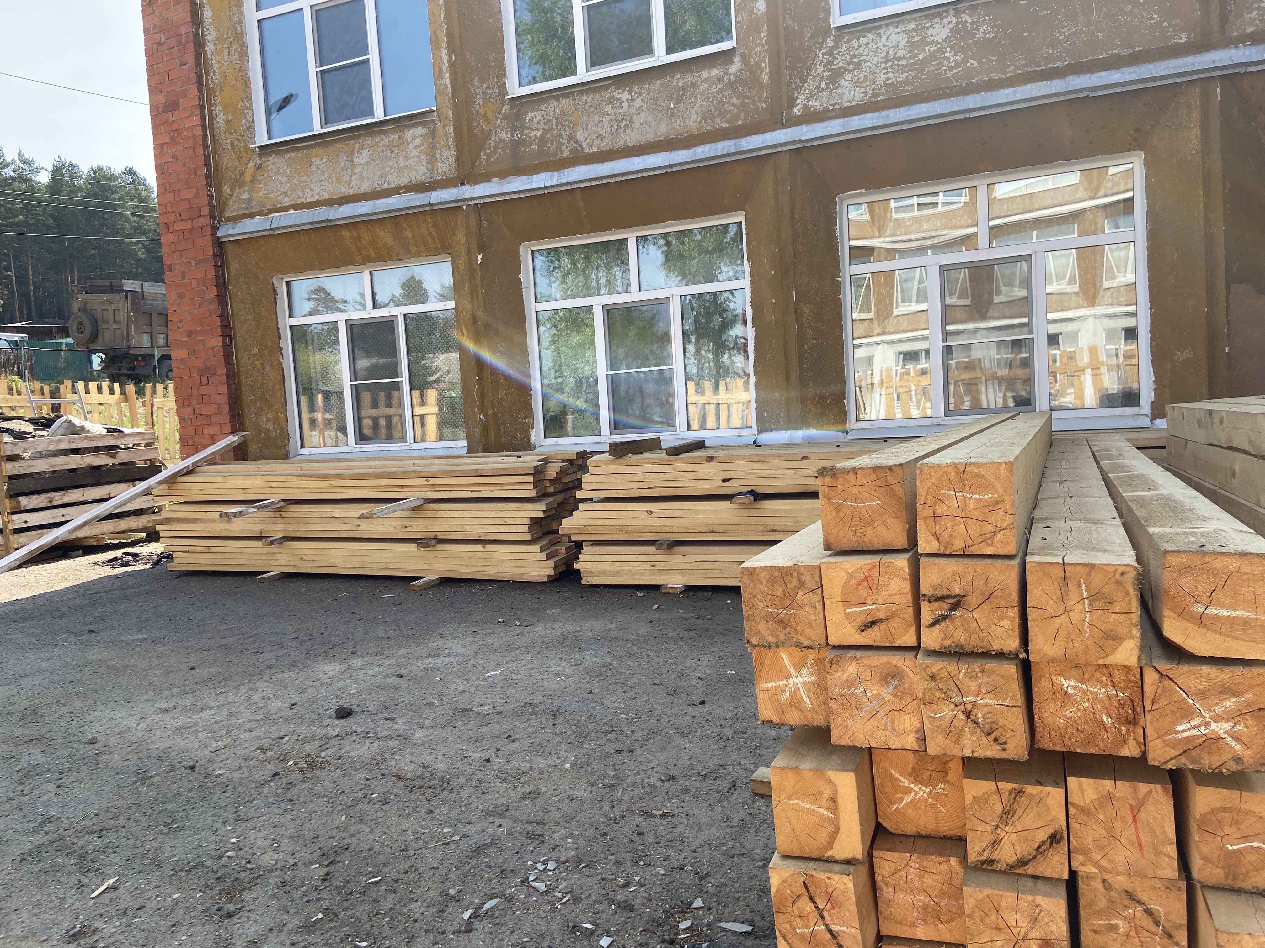 Разобрали кровлю над пищеблоком и младшим блоком, выполнены кирпичные столбики для крепления мауэрлата, начали крепить мауэрлат. Разобрали часть отмостки. Частично очистили фасад от старой краски, заштукатурена одна стена актового зала.
